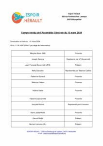 Espoir Hérault Association (loi de 1901) reconnue d'intérêt général – J.O. du 8 mai 1981